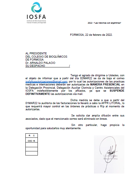 IOSFA COMUNICADO Referente a la baja del correo iosfafsaautorizaciones@gmail.com